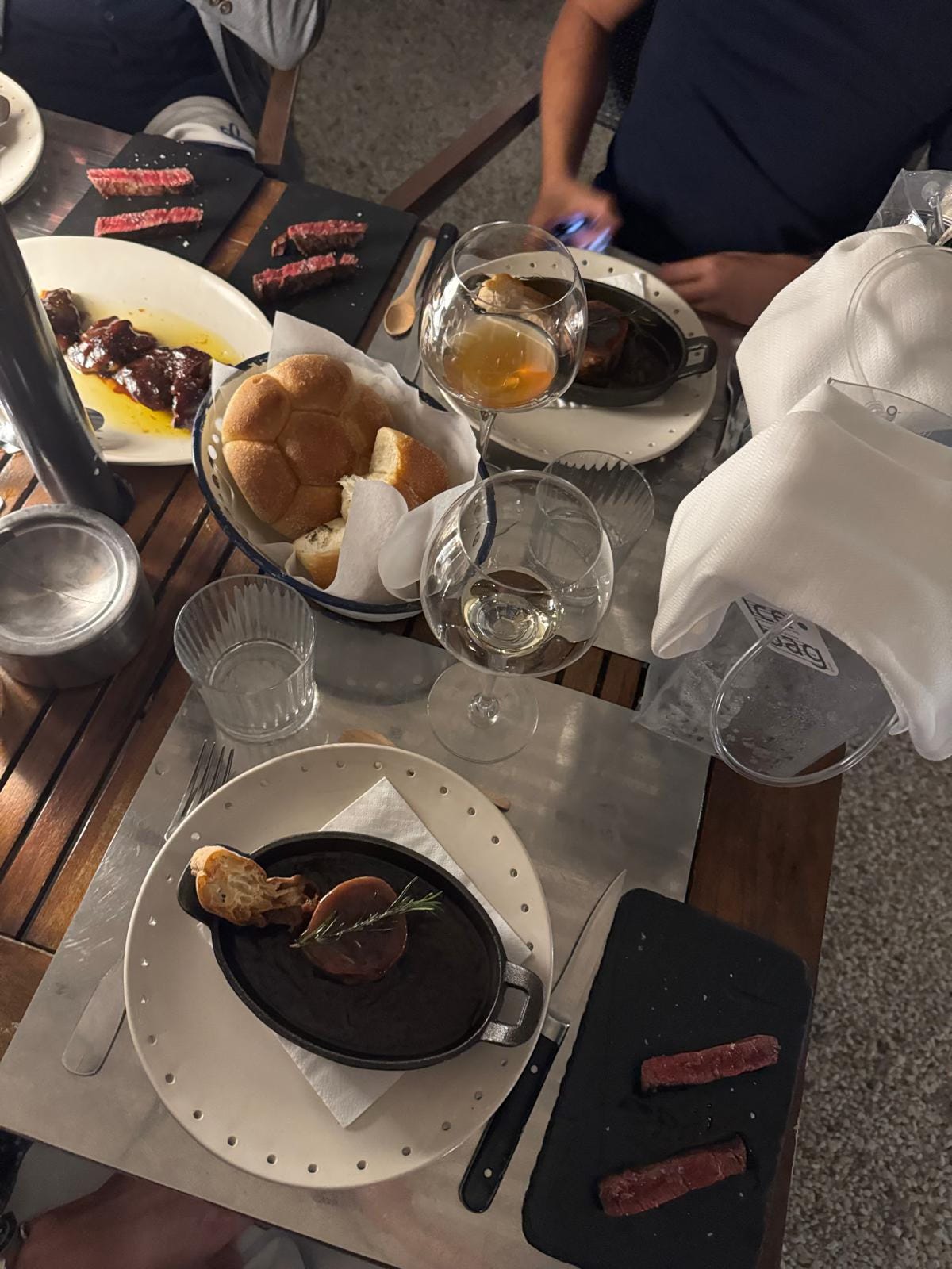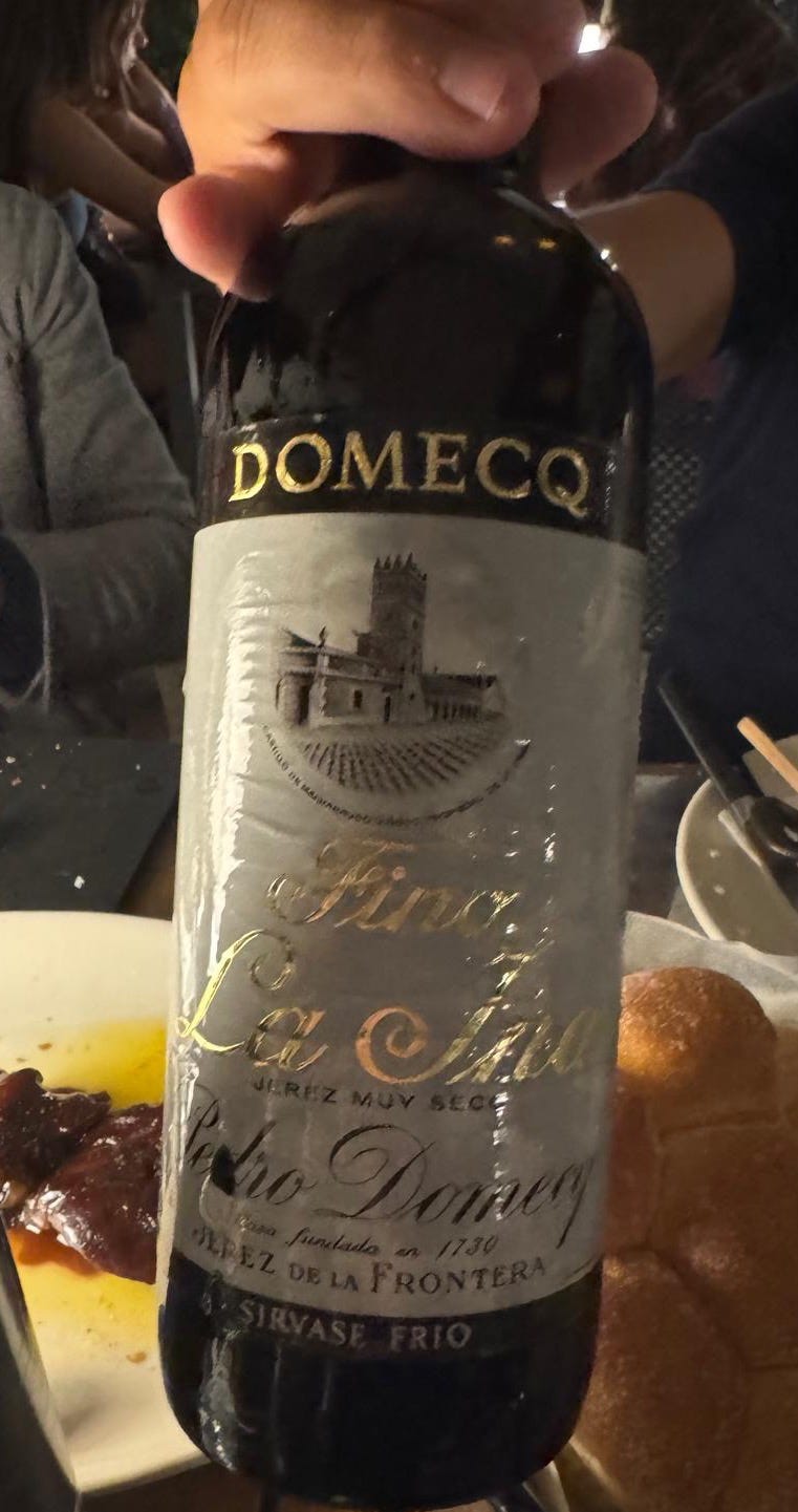 Mientras la conversación fluía, Guille se animaba a abrir otra botella y a servirnos a todos. Probamos varios vinos y Champagne. El que más disfruté fue un Jerez seco, el Fino La Ina de Pedro Domecq, que en mi paladar inexperto resultaba delicioso. De la comida solo os diré que nos trajeron la famosa tortilla del Sacha, tuétano —que para mí es un auténtico manjar—, txuleta… y no os cuento más para que no sintáis envidia.