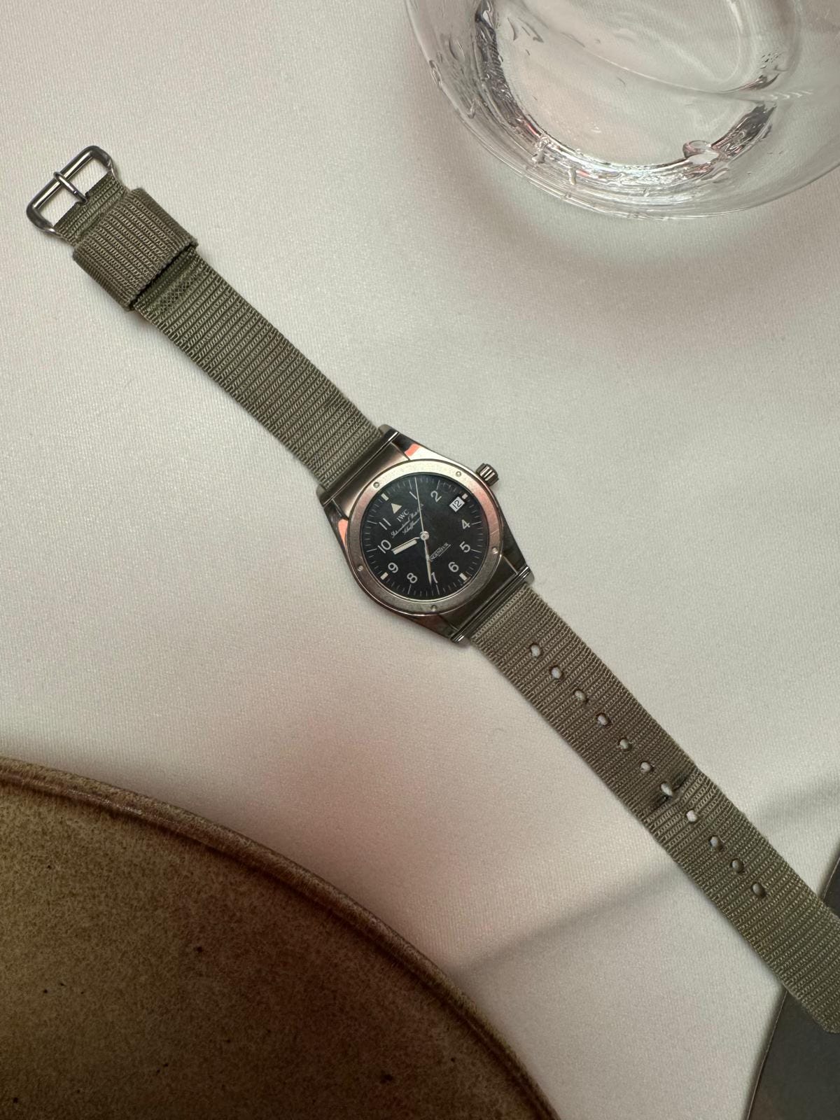 En aquel momento llevaba un IWC Ingenieur de los años 90: una versión en acero con correa NATO, puesta por él, y con un movimiento de cuarzo que lo convertía en un reloj fino y ligero. Hay marcas que tienen esa capacidad de crear relojes con alma, e IWC es una de ellas.